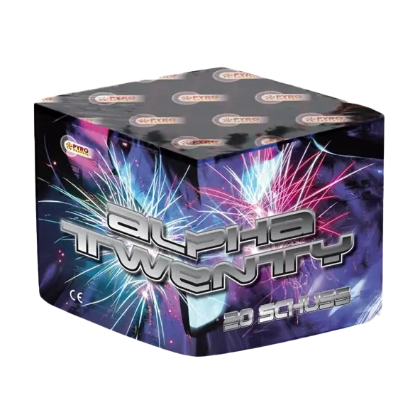 Die Alpha Twenty liefert 20 kraftvolle Schuss mit roten und grünen Chrysanthemen und markantem Schweifaufstieg.