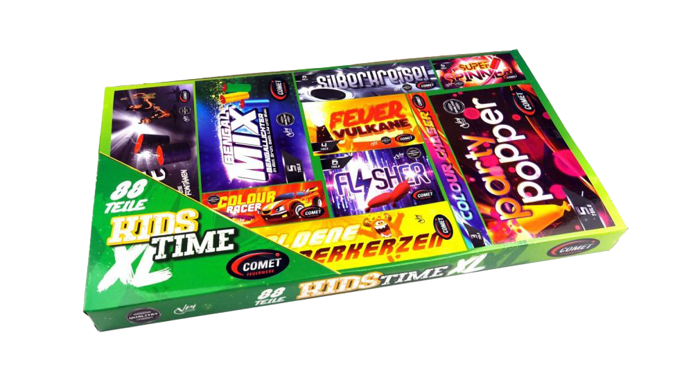 Kids Time XL ist ein großes Jugendfeuerwerk-Sortiment mit vielen unterschiedlichen Effekten für eine lange, abwechslungsreiche Abfolge.
