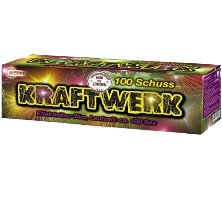 Mit 100 Sekunden Laufzeit und einem 30-mm-Kaliber liefert das Verbundfeuerwerk "Kraftwerk" klare, weit sichtbare Effekte in etwa 35 Metern Höhe. Die 100 Schuss steigen in konstanter Abfolge auf und erzeugen ein strukturiertes, durchgehendes Effektbild. Als Einheit der Kat. F2 bietet es eine komplette, zusammenhängende Sequenz ohne Zündunterbrechung.